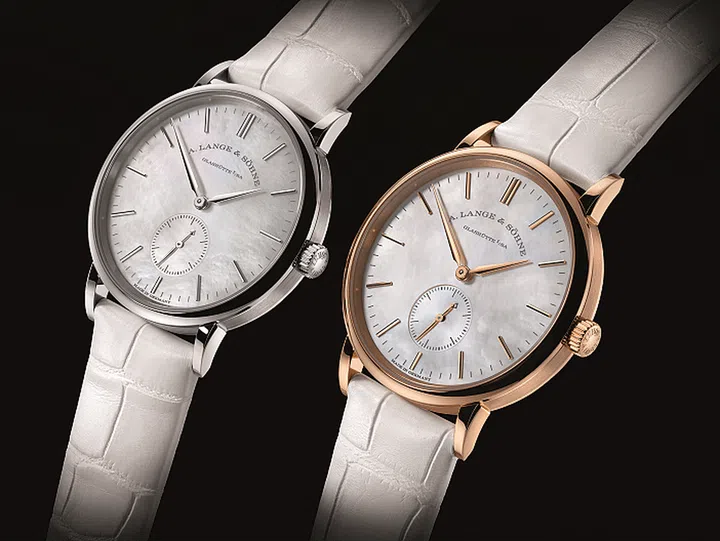 朗格的女装腕表一贯走简约风格,今年两只Saxonia的女表分别以白金与玫瑰金为主要材质,白色珍珠母贝的表盘素雅大方。细长的指针在素净的表盘上摇摆,配以白色鳄鱼皮表带,温柔内敛。虽然不是超薄款式,但是7毫米的厚度置于腕间非常的轻巧。