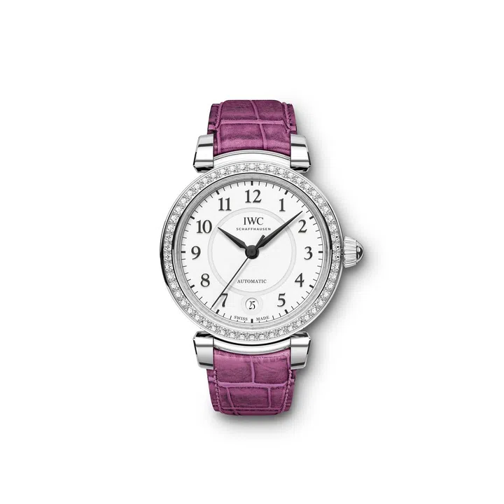 IWC为女性专门打造了两款基本款腕表,Da Vinci Automatic 36是其中之一。而在Da Vinci Automatic 36的几款不同样式的腕表中,其中又以镶钻表圈的IW458308最引人瞩目。镶嵌了54 颗钻石的它搭载莓粉色Santoni鳄鱼皮表带,亮眼的色调与镀银表盘上的黑色显示形成鲜明对比。简洁内敛的表盘设计显得大方,但配以这样独特颜色的表带,又透露着一丝少女般的可爱气息。