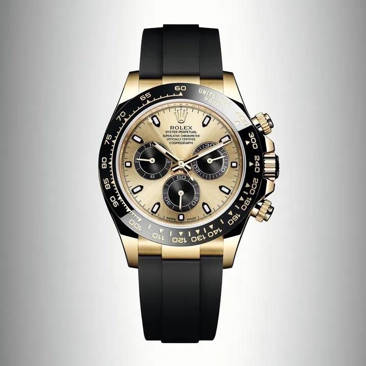 时至今日,劳力士(Rolex)的迪通拿(Daytona)依然是众多男士最向往的腕表之一。去年品牌在巴塞尔钟表展(Baselworld)推出的新款蚝式恒动宇宙计型迪通拿(Oyster Perpetual Cosmograph Daytona)的黑色陶质 Cerachrom 外圈致敬这款传奇腕表1965 年版黑色树脂玻璃外圈。配备劳力士研发及拥有专利的 Oysterflex 表带。此创新设计将金属表带的坚固可靠,以及橡胶表带的灵活、舒适及美感集于一身。