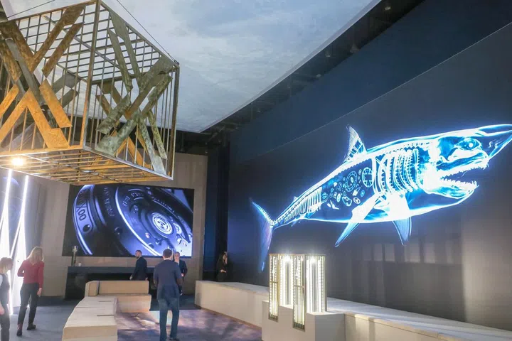 今年是雅典表(Ulysse Nardin) 首次参与日内瓦表展,展厅设计很吸睛,被设计成海底世界,在展厅的中央是一个巨型的鲨鱼笼,到了傍晚鲨鱼笼就会降下成为DJ遥控台。在天花板和地板上都投影着一条在海洋里畅游着的巨鲨,而在墙壁则展示了鲨鱼的X光照。