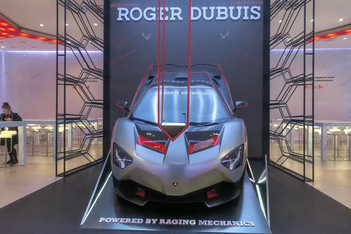 蓝宝基尼(Lamborghini)特别为一个尊贵客户定做了一辆全世界独一无二的跑车,而这辆跑车据说比隔邻展示的战斗机还要昂贵,这也成了整个表展上最贵的展厅。罗杰杜彼(Roger Dubuis)也从这辆蓝宝基尼One-off 系列取得灵感,设计了全世界唯一的Excalibur One-off 腕表,有趣的是这只腕表的设计融入了Roger Dubuis, Lamborghini 和Pirelli 的设计元素。据了解腕表标价超过106万瑞士法郎,已被一个来自新加坡的客人买下。