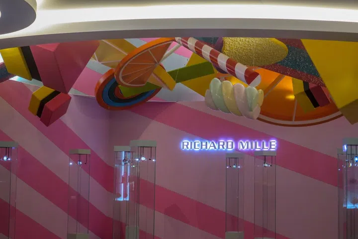 一向以复杂腕表闻名的理查德米勒(Richard Mille) 抛开过去严肃的形象,把展厅布置成一个糖果店造型,为表展注入了几分甜意。墙壁上都以粉红色为主,天花板上悬挂着糖果和水果,带出今年的Bonbon 水果和糖果系列主题。