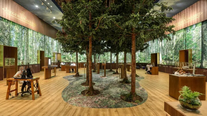 积家(Jaeger LeCoultre)今年的话题之作就是这款,超卓传统大师系列球型陀飞轮西敏寺钟乐万年历腕表 ( Master Grande Tradition Gyrotourbillon Westminster Perpetual) ,全世界只限量18只。腕表强调精准,而整个展厅的布置也以精准为主题。场内种了10棵从瑞士Vallée de Joux森林带入展厅内的大树,四面墙的树林景象都是由摄影师在夏天早上7点32分在晨光第一线最充足的时候拍摄。展厅还喷洒了特别带有森林气味的天然香气,如果静下来还能听到虫鸣鸟叫。