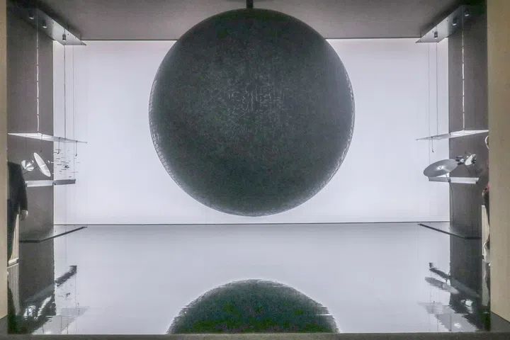 在伦敦居住的日本艺术家Hideki Yoshinoto从今年爱马仕(Hermes)的Arceau L'heure de la Lune双月相腕表取得灵感。该腕表的独特之处在于,能在同一个时间和表面上同时报读南半球和北半球的月相显示,同样的一个月球,但从不同的角度来看就有所不同。在展厅里,因为地板的倒影,远看仿佛看到两个旋转的巨型“月球”,实际上就只是一个“月球”。整个宽达3.5毫米的“旋转”月球,是以上千个小太阳能板组成。展览后,这些太阳能板就会再循环。