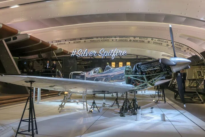 万国表(IWC)今年把焦点瞄准在飞行表,推出全新的喷火战机 (Spitfire) 系列腕表。展厅布置得像是一个机仓,而在展厅中央就是一架修复好的Spitfire 喷 火战斗机。之前,万国表也宣布将赞助英格兰堡特比飞行学院(Boultbee Flight Academy)两位创始人:Steve Boutlbee Brooks和Matt Jones完成“最长的飞行”全球远征计划。他们就会开着这架经过长年精心修复的银铬合金喷火战机从Goodwood出发,空中远征26个国家进行展示与教学。