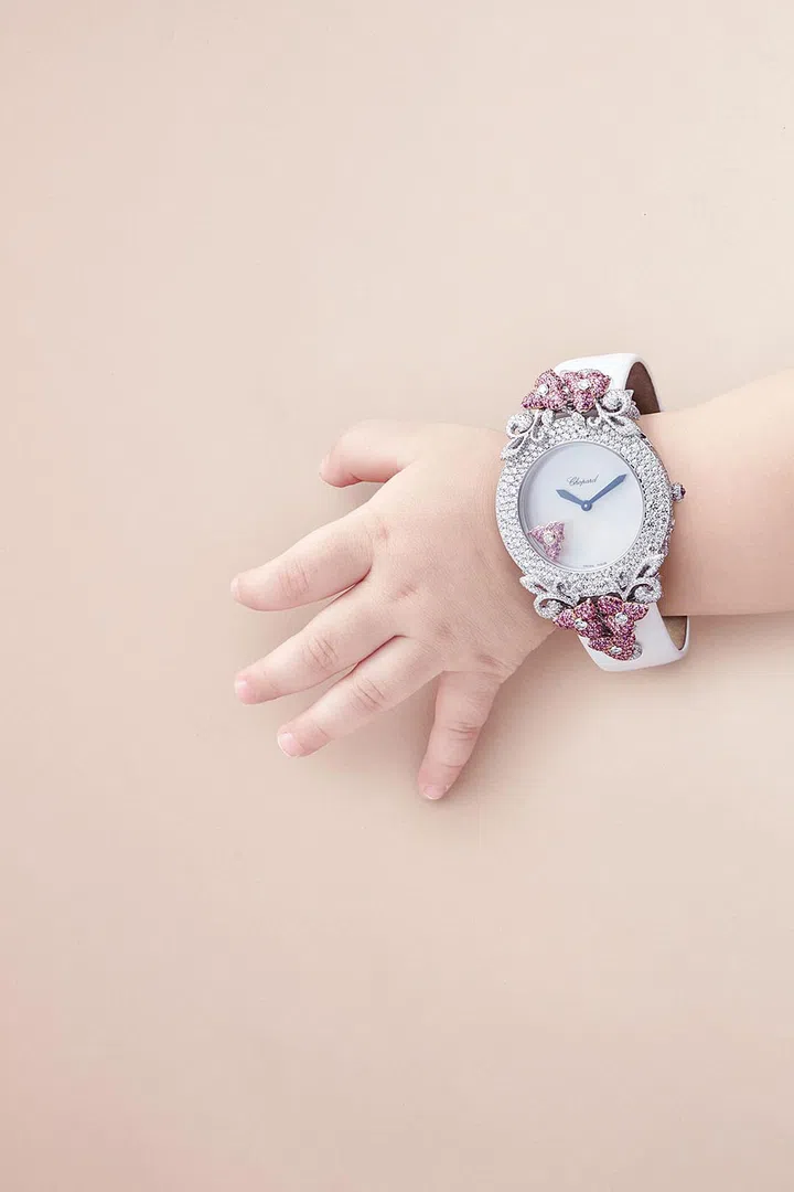 以山茶花为造型,采用无上表桥设计,以镂空设计展示其精致机芯。18K白金表壳镶嵌47颗总重3.93克拉的长阶梯形切割粉色蓝宝石,18K白金表圈镶嵌42颗总重2.4克拉的长阶梯形切割钻石颗52颗总重1.48克拉的明亮式切割钻石。