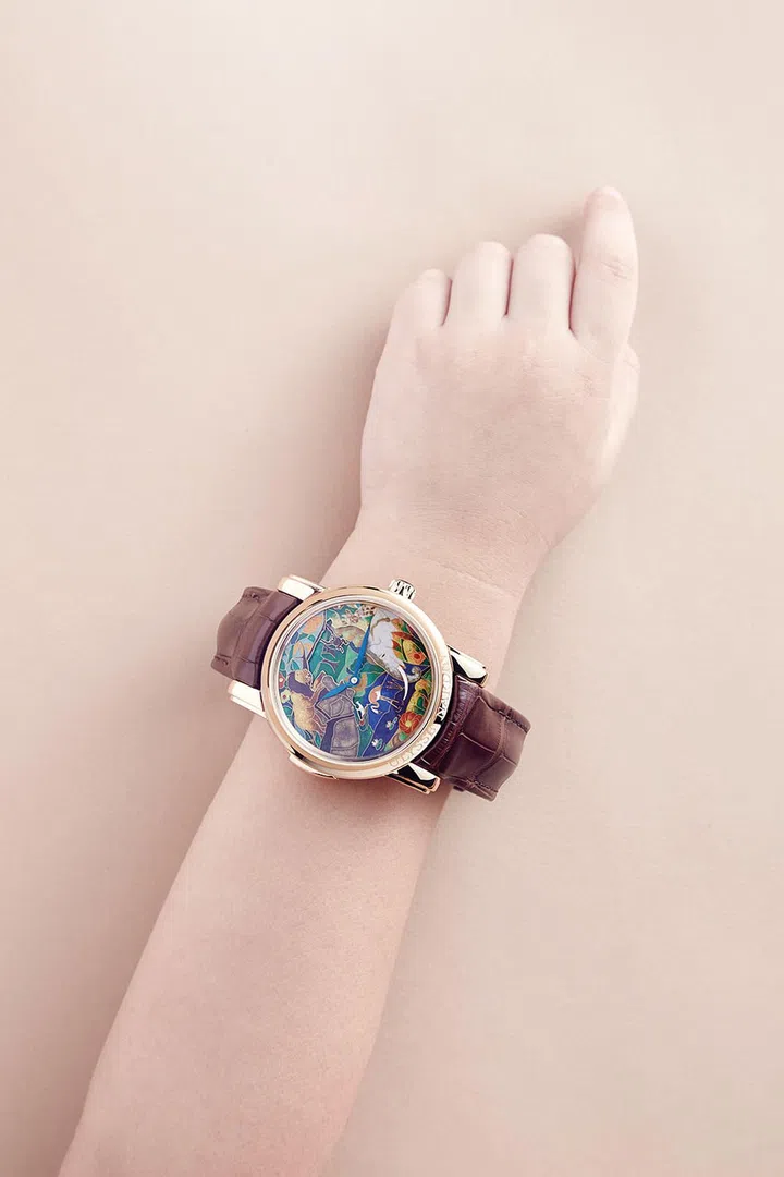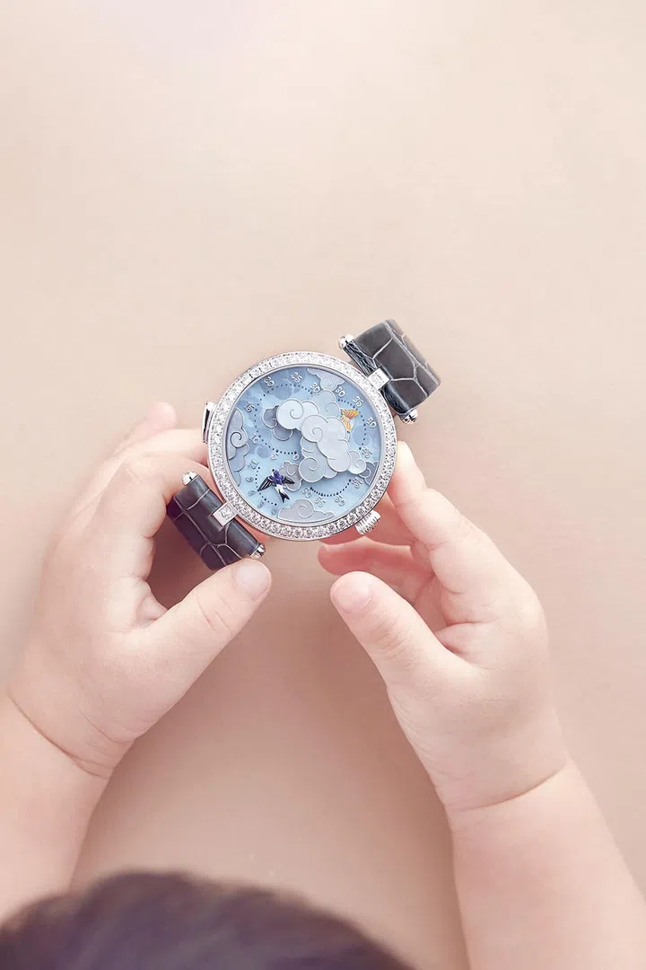 诗意复杂功能系列,38毫米白金表壳,表圈镶嵌圆形钻石,珍珠贝母表盘,白金蝴蝶指示分钟,燕子指示小时,细工彩绘。