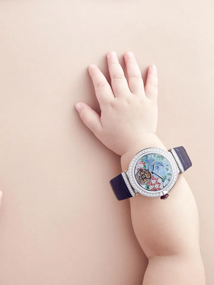 18K白金表壳镶嵌45颗明亮式切割钻石,表冠镶嵌蛋面切割红碧玺与明亮式切割钻石,表盘饰以蓝色珍珠母贝天空、天堂鸟与手工绘制花草植物图案