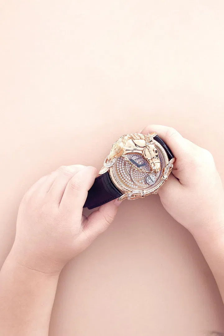 玫瑰金表壳,双层掐丝珐琅彩绘表盘互相重叠,交错出一条小鱼被鳄鱼抓在爪间,猴子在树枝上前后摆动。三问杠杆运转时,表盘上的狮子会匍匐向前并抓住猴子。