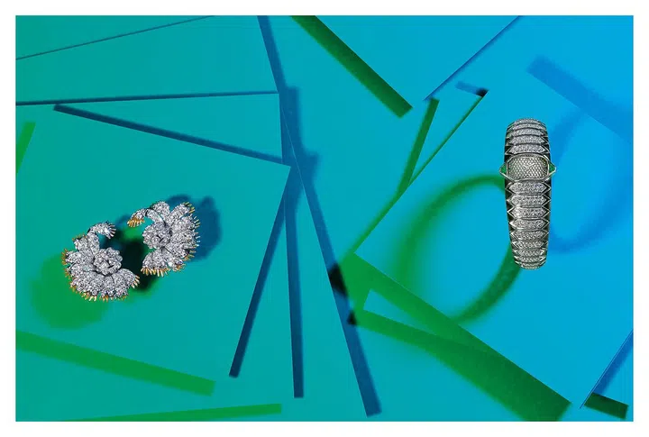 右:Tilda’s Bow系列多形切割钻石项链胸针,钻石共重49.47克拉/Graff。