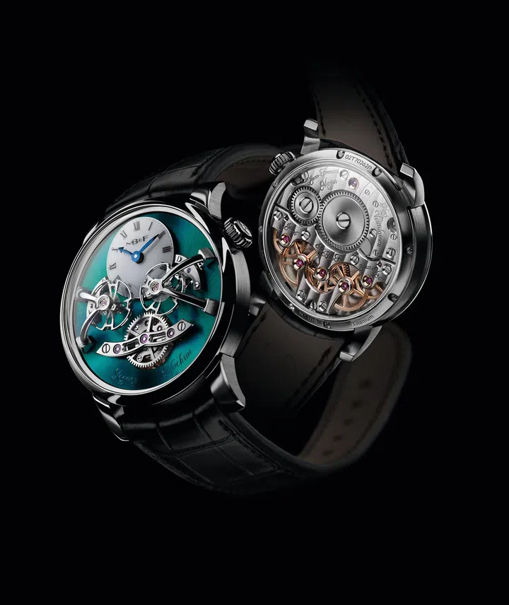 独立制表商MB&F最引以为傲的便是前卫的腕表设计,极致的工业美学,每次看到不停转动的内部器件,都让人振奋不已。此次它带来的Legacy Machine N°2 Titanium腕表并非全镂空设计,绿色的表盘夺人眼球,但是依然能让人体会到“一览无余”的工业之美。圆弧形平衡摆轮桥板恢弘阔气,比起之前的LM2款式却更添几分温婉气息。LM2高悬半空的双辐式摆轮堪称美学与科技相结合的典范之作,令人目不转睛,表盘中央醒目的行星齿轮式差速器更加摄人心魂。