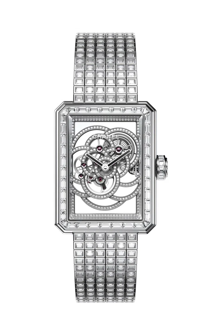谁也没有想到会将香奈儿与镂空腕表联系在一起。品牌延续经典的Premiere,将腕表的内部器件完全暴露在视野之内,搭载香奈儿第二款自制机芯Calibre2,将机械做成了品牌图腾山茶花的模样,在粗犷的工业语言之下增添了几分灵动优雅。Calibre 2机芯由巴黎芳登广场的创意工作室提出最初设想,再由香奈儿位于瑞士的腕表工厂Chatelain构思、研发、调配和组装而成。18K白金材质的表身由里到外布满着钻石。
