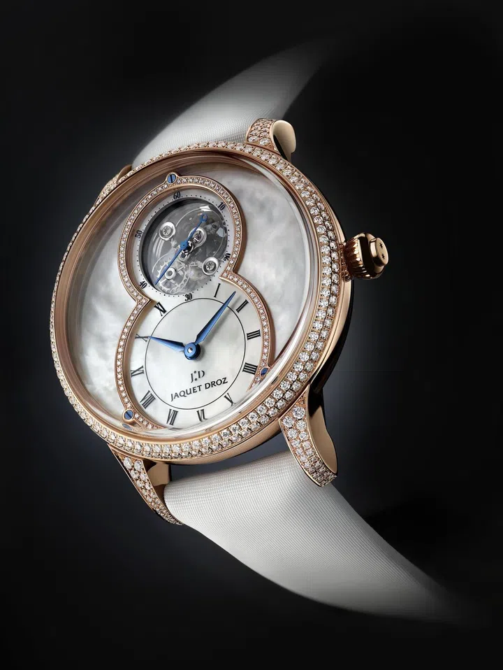 大秒针在雅克德罗(Jaquet Droz)的制表历史中一直占有着举足轻重的地位。如今,品牌重新演绎此经典表款,选择珍珠母贝,展现女装腕表的瑰丽典雅。珍珠母贝的云纹与镶嵌着明亮式切割钻石的红金表壳以及白色织缎表带交相辉映。品牌首次为陀飞轮装配硅质擒纵叉和摆轮游丝,提高精准度。透明的设计让陀飞轮的运动之美完全展露出来。
