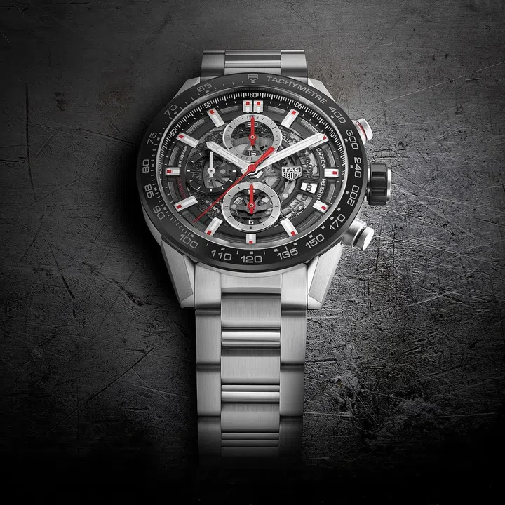 2015年,泰格豪雅(Tag Heuer)推出Carrera系列Heuer-01 45毫米镂空腕表,震撼的设计让它名声大噪,今年,品牌再次推出更加轻巧的43毫米直径的腕表。抛光陶瓷测速表圈的明亮光泽与标志性的12个模块化结构构成的抛光精钢表壳相互呼应。Heuer-01经典的镂空表盘透露出机芯的机械之美。计时腕表操作杆和镂空的日历视窗可以从表盘侧方一览无遗。机芯所有计时功能都使用红色表示,向赛车致敬,也体现品牌如赛车般的指标理念。