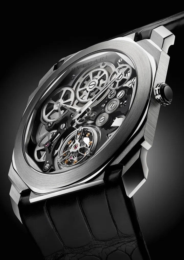 宝格丽(Bulgari)的Octo系列自问世以来一直以前卫大胆的风格引领潮流,110道切面的表壳将工艺的精准展现得淋漓尽致。铂金表款搭配陶瓷表圈,搭载手动上链机芯,Finissimo全镂空超薄陀飞轮饰以13颗珠宝与8颗滚珠轴承,藉此减少机芯厚度,宝格丽陀飞轮自制机芯BVL268至今仍是最薄记录保持者。优雅与阳刚气质的完美结合让这款腕表成为宝格丽展台上最亮眼的存在。
