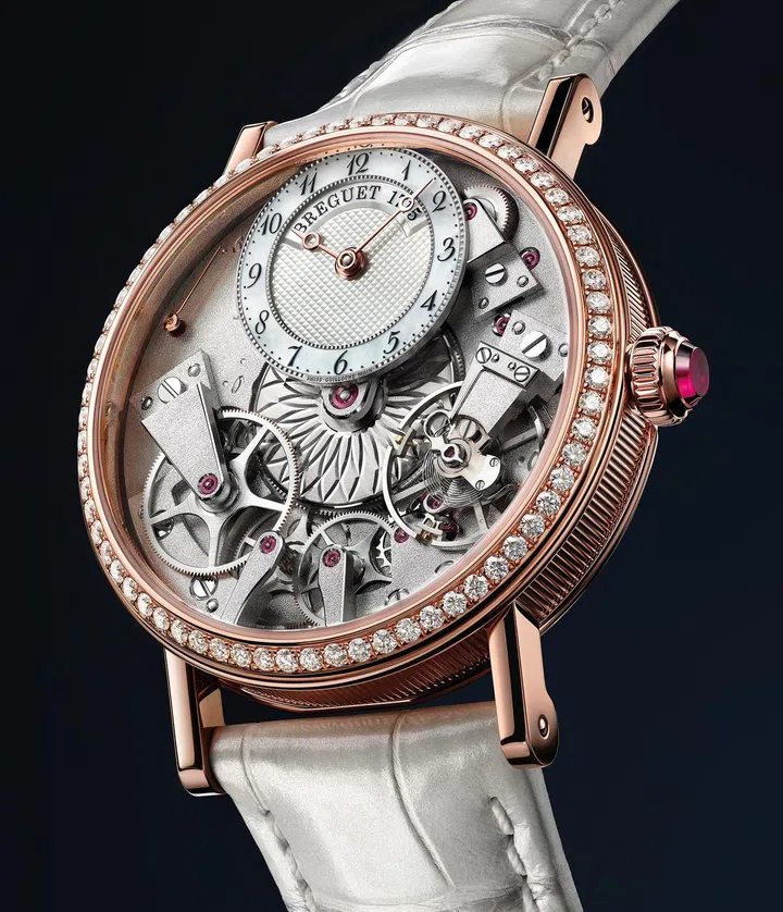 宝玑(Breguet)的传世(Tradition)系列自2005年诞生以来,这回终于新添了一款玫瑰金女装腕表,让历来被视为男士专属的复杂腕表也成为女性的挚爱。腕表中心可见装饰玫瑰图案的发条盒,正上方12点钟位置则是饰有玑镂“巴黎钉纹”(Clou de Paris)的珍珠母贝表盘。醒目的桥板与齿轮展现机械的灵动之美。镀铑主机板与桥板采用喷砂处理,与镶嵌68颗美钻的玫瑰金表壳相映成趣。这款Tradition Dame腕表搭载505SR机芯,配备硅质擒纵叉擒纵结构及硅质宝玑游丝。