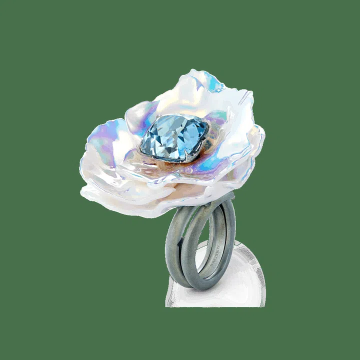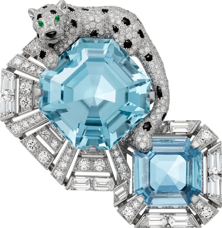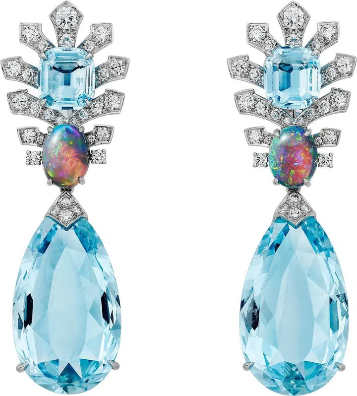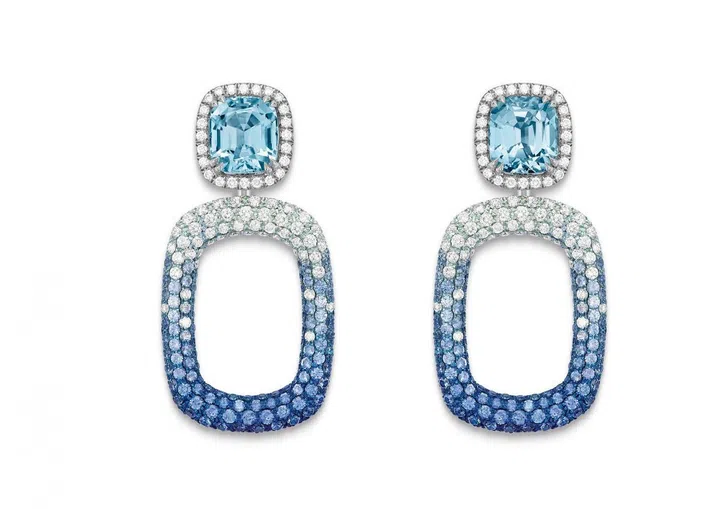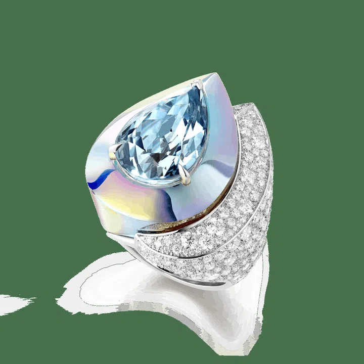 Promenades Impériales戒指,白金镶嵌枕形切割海蓝宝石、枕形切割钻石、长阶梯形切割海蓝宝石和明亮式切割钻石/Chaumet。
