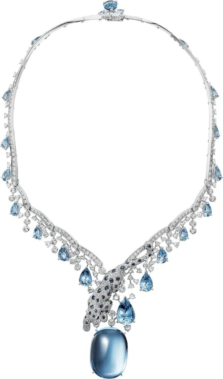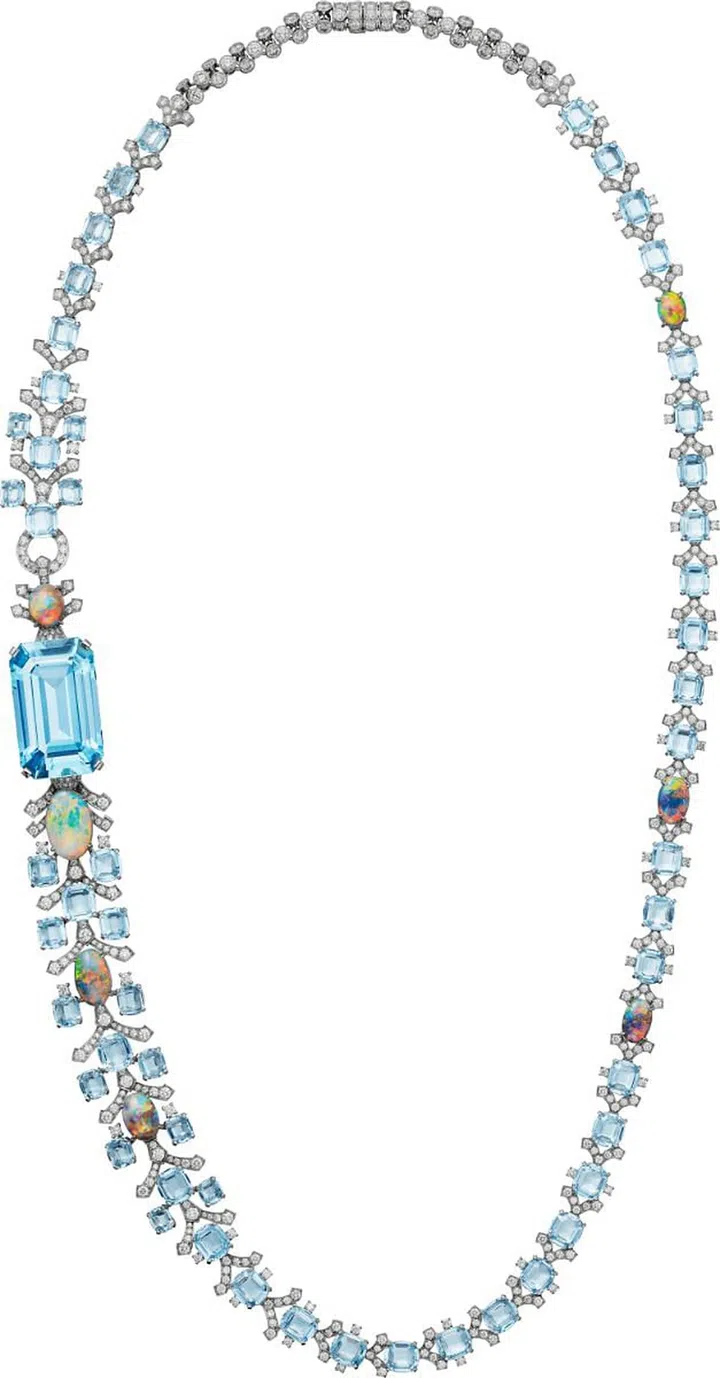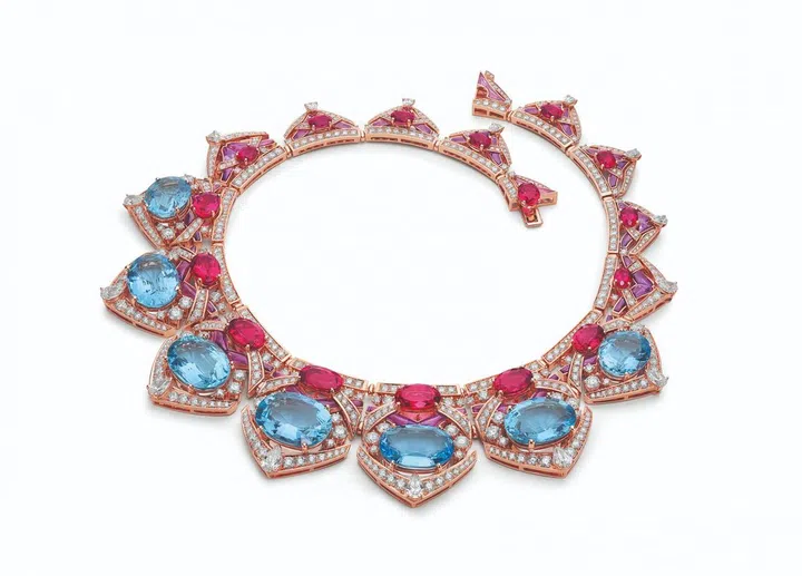 高级珠宝项链,玫瑰金镶嵌7颗椭圆形海蓝宝石、16颗椭圆形卢比来碧玺、32颗弧圆形切割紫水晶、15颗梨形钻石、28颗圆形明亮式切割钻石,饰以密镶钻/Bvlgari。