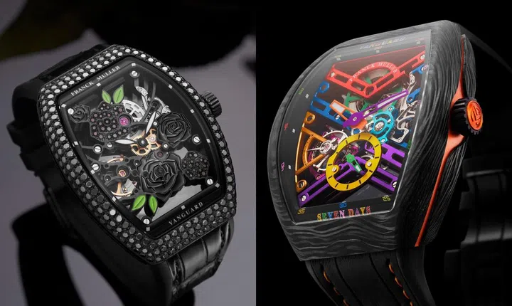 法穆兰(Franck Muller)全新Vanguard Rose Skeleton Black Diamonds表壳上镶有422颗黑色圆形明亮式切割钻石,而表盘上则镶有75颗圆形明亮式切割宝石,以更艳丽动人的姿势吸引眼球。新款Vanguard Skeleton Colour Dreams系列则提供黑色碳纤维、拉丝钛金属和精钢三种不同型号,并搭载完全由法穆兰自主设计和制造的手动上弦机芯,该机芯装配镂空桥板,具有长达7天动力储存。 缎面桥板经过阳极氧化处理,使色彩更加丰富。桥板的设计凸显了腕表的独特架构,不仅绚丽多彩,而且坚固耐久。