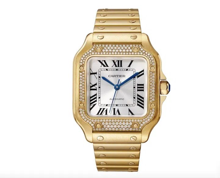 Santos de Cartier是卡地亚最经典长卖的表款之一,这款中号女士表款,方形表壳延续了系列一贯的优雅含蓄风格,设计历久弥新。以18K黄金材质打造,表圈镶嵌了206颗明亮式切割圆钻,总重0.64克拉,同时配备可替换式金属表链与皮表带,绝对是一款经得起时间考验的传世美物。