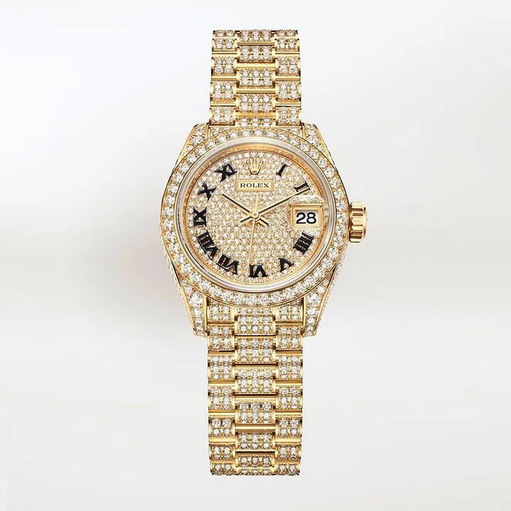 劳力士2021年的另一焦点新品,闪爆眼球!金光灿灿的Oyster Perpetual Lady-Datejust蚝式恒动女装日志型腕表以18K黄金制造,从表壳、表圈、表带到表盘共镶满1089颗钻石,极致华丽,璀璨气派。