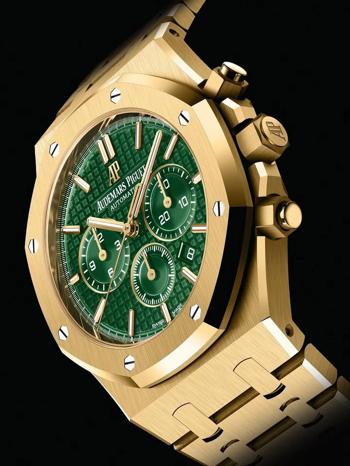 表坛近年也掀起绿色风潮,顶级大牌纷纷推出绿色表盘腕表。爱彼今年一口气新增了5款绿色系面盘的Royal Oak皇家橡树腕表,为品牌经典不败的腕表系列注入活力新意。其中这款限量版的自动上链计时码表,表壳为18K黄金材质,与绿色“Grande Tapisserie”大格纹装饰表盘形成鲜明对比,大胆的色彩组合,霸气抢眼,搭载爱彼2385自动上链机芯,表壳底盖还镌刻有“Limited Edition 125 pieces”(限量125枚) 字样。