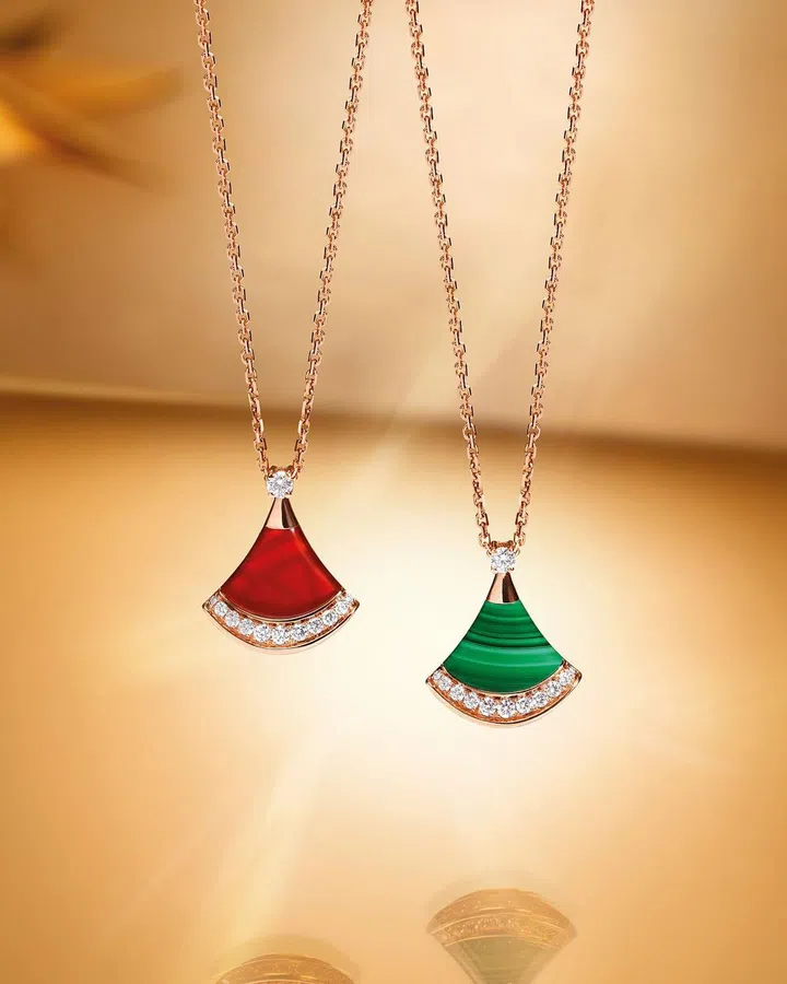 宝格丽(Bulgari)Divas' Dream系列18K玫瑰金项链精妙诠释欢愉女性魅力,以缤纷多彩的设计演绎标志性扇形图案。此系列的标志性美学元素通过精致的吊坠呈现,吊坠巧妙镶嵌一颗绿色孔雀石或红玉髓,更点缀密镶钻石。小巧的项链便于佩戴者打造风格百变的造型,既可以通过混搭、自由搭配和叠戴彰显独特创意,亦可以通过缤纷色彩展现别样的女性魅力。