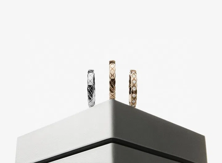 香奈儿(Chanel)Coco Crush系列精致款戒指以米色K金、黄K金或白K金打造,有无钻或镶钻款式可供选择,作品灵感源于香奈儿品牌的标志元素:菱格纹图案。
