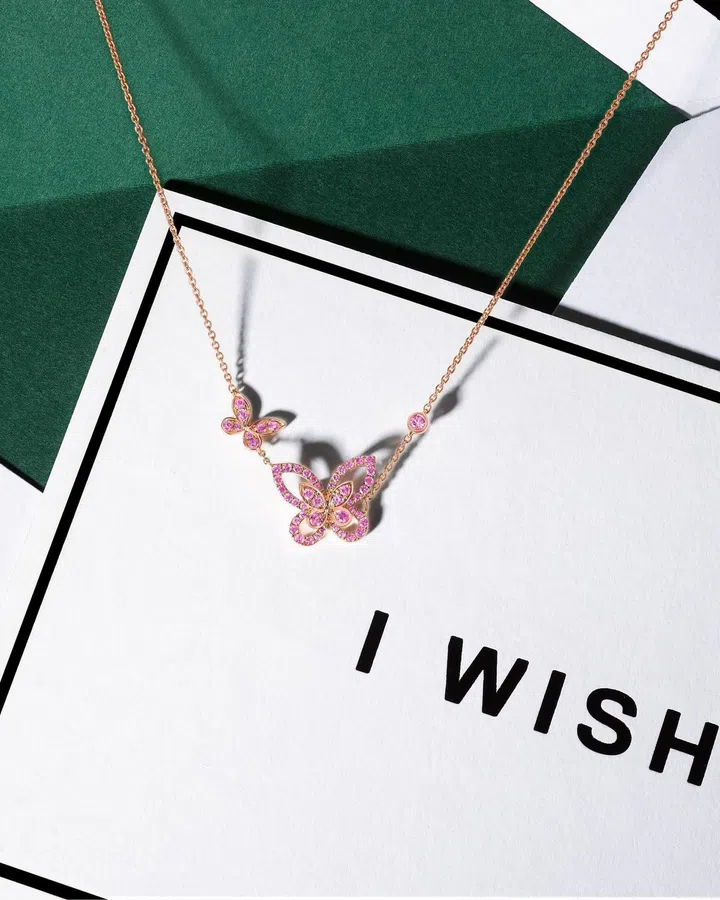 优雅灵动的蝴蝶一直是格拉夫(Graff)设计团队的灵感泉源,多年来经过无数创意演绎,成就一系列瑰丽珠宝设计包括时尚项链、耳环,手链,和萦绕指尖的迷人戒指。格拉夫配合圣诞佳节特别推出密镶粉红蓝宝石的蝴蝶幻影系列18K玫瑰金吊坠,玩味演绎最受欢迎的经典设计。这款特别版吊坠以动人唯美的粉红蓝宝石点缀两只优美蝴蝶的翅膀,别致的玫瑰金色调映衬她独特的个性和风格。