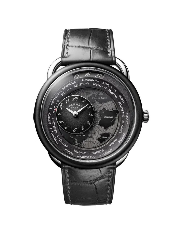 Arceau Le temps voyageur漫游时光腕表,搭载爱马仕(Hermes)独家研发的“漫游时光(Travelling time)”模块,以圆型表盘显示24个时区,焕新诠释世界时这一机械腕表的复杂功能。活动计时盘运用引力原理,跃然表盘之上, 如卫星般环绕着虚拟地图旋转。光阴流转之际,表盘亦随之星移斗转,呈现全新维度。表盘12点位置显示家乡时区的外围视窗,其内部由122枚零部件组成,装置厚度仅为4.4毫米。“漫游时光”复杂功能搭配爱马仕自制H1837自动上链机芯,实现了技术与美学的和谐统一。整体计时机械浑然天成,令小时、分钟及带有城市标志的双时区时间得以同步显示。