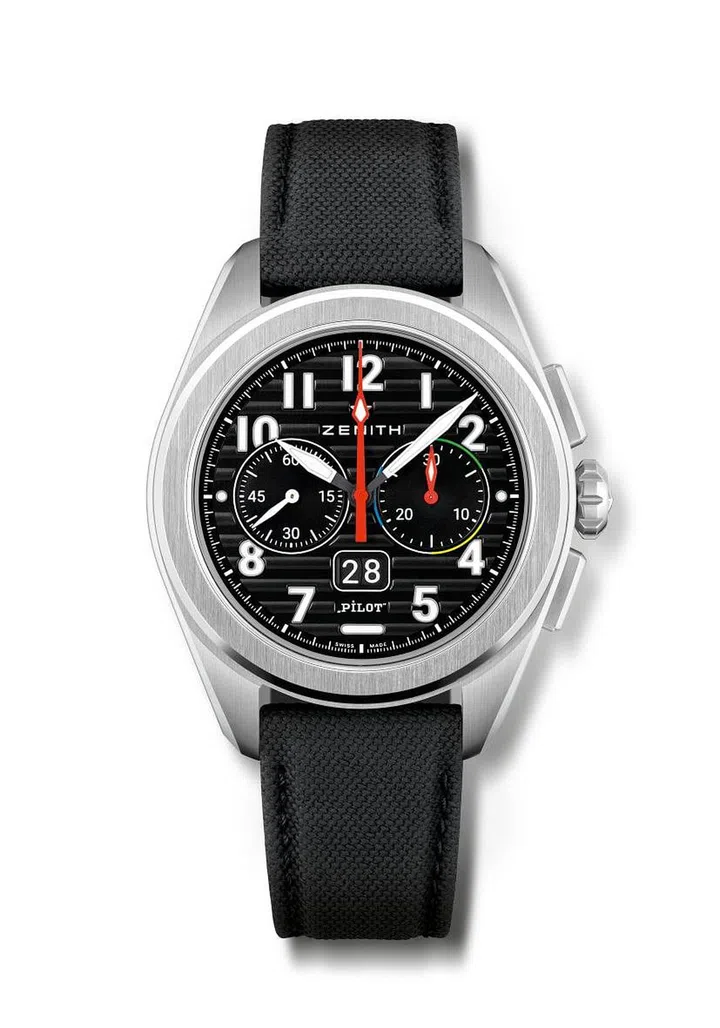 真力时(Zenith)Pilot飞行员系列大日历飞返腕表推出两款风格各异的版本,皆采用42.5毫米直径表壳。其中,精钢表款借鉴出众不凡,被誉为“Rainbow Flyback”的真力时El Primero飞返计时码表。此款计时码表的分钟计时盘采用相互交替的色彩搭配,更易于区分5分钟时标。此计时码表的中央秒针和分针为亮橙色,致敬1997年问世的标志性真力时El Primero Rainbow腕表。腕表搭载的全新El Primero 3652型高振频自动上链计时机芯,振频为5赫兹。同时,腕表亦融入了两项专为真力时PILOT飞行员系列甄选的全新功能——大日历与飞返功能。