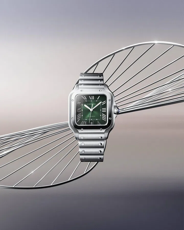 Santos腕表流畅线条与符合人体工学的细腻设计, 使之成为卡地亚(Cartier)隽永风格的标志性作品之一。这一经典系列不断革新,全新精钢表款,大胆探索全新配色。继海军蓝色之后,卡地亚再度开拓崭新色彩疆域,大胆运用深绿色。全新表款的表盘呈现细腻渐变色彩,并散发金属感光芒。表盘由工匠手工覆以一层薄薄的彩色漆面,纤薄而通透的质感,令色彩更显亮眼深邃。腕表备有大号表款和中号表款,每一枚皆搭载卡地亚1847 MC型工作坊精制自动上链机械机芯, 并搭配可替换式精钢表链和鳄鱼皮表带。配备卡地亚专利技术——QuickSwitch表带快速替换系统,可随意替换表带或表链。
