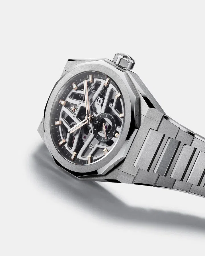 真力时(Zenith)DEFY Skyline Skeleton镂空天际腕表作为世界上首款,也是唯一一款配备 1/10 秒指示盘的镂空腕表,于今年年初首次亮相。基于此款腕表,品牌推出DEFY Skyline Skeleton镂空天际腕表精品店特别版,带来明亮的灰金对比色彩。全新腕表采用全新的银灰色调,并点缀以璀璨的金色光芒。镂空表盘采用均衡对称的四芒星设计,在镂空腕表中非常罕见,同时也是对真力时DEFY 20世纪60年代使用的“双Z”品牌标志的致敬。此外,腕表配备银灰色表盘,镶嵌于深色刻度圈上的镀金巴顿式时标,并涂覆了超级夜光物料,配以相应的指针,以便清晰读取时间。此款腕表搭配银灰色表盘,于深色刻度圈之上镶贴镀金巴顿式时标,涂覆Super-LumiNova超级夜光物料,搭配同款指针,便于清晰读时。6时位置的1/10秒计时盘以恒定速度持续转动,每10秒旋转一圈,这一前所未有的功能是新一代El Primero高振频自动上链机芯独有的制表特征之一。