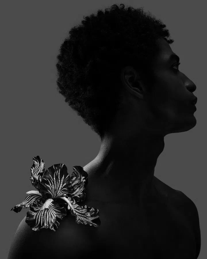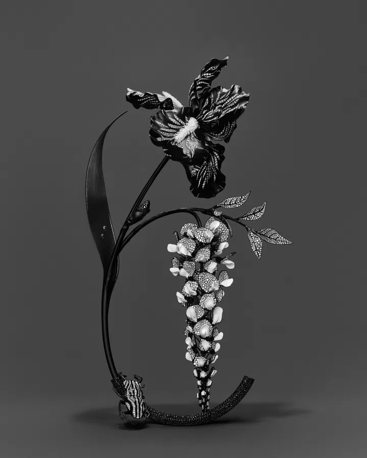 鸢尾花、紫藤花、鹿角锹形虫在Composition N°3主题中大放异彩。工匠大师充分利用不同深浅的黑色调渲染鸢尾花,令花瓣呈现哑光质感,同时搭配亮光纹理。镶嵌于白金镶座的晶莹钻石,构成了耀眼的白色线条,勾勒出鸢尾花的曼妙轮廓,亦在鸢尾花表面闪耀迷人光芒。在制作紫藤花时,工匠面临双重考验,既要尽量减轻重量,又要确保其稳固。为此,工匠将陶瓷、铝和钛金属组合在一起,将其总重控制在 150 克以内。白色陶瓷和铺镶钻石,令叶片和花瓣更显亮泽。一只鹿角锹形虫悄然停在作品底部。虫身采用钛金属制作,饰有白金条纹,并镶嵌钻石。花瓶以铝和钛金属打造,镶嵌黑色尖晶石。鸢尾花可拆下作肩饰佩戴,紫藤花则适合点缀秀发或服饰。