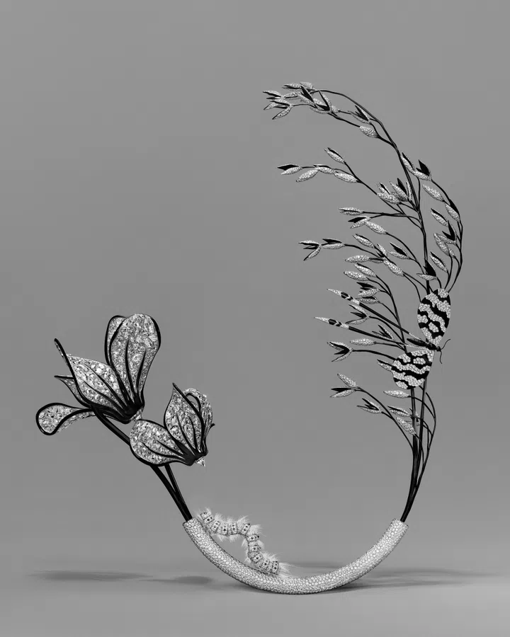 仙客来的白金花瓣上镶嵌将近 700 颗玫瑰式切割钻石,构成令人目眩的钻石玻璃窗花图案,流光溢彩。燕麦穗的茎以钛金属打造,并覆以黑色涂层。悉心雕刻的小穗则镶嵌璀璨钻石。这束花植上缀有两只昆虫。毛毛虫以白金制作,并镶嵌钻石和黑色尖晶石。虫身上的刺毛形似创意工作室中使用的画笔纤维。铰链装置令毛毛虫伸缩灵活,栩栩如生。蝴蝶则舒展点缀黑色漆饰的白金镶钻翅膀。白金花瓶满镶璀璨钻石,熠熠生辉。同样采用可转换式设计,仙客来配备旋转装置,可转换为手镯或胸针佩戴,燕麦穗为发饰珠宝,毛毛虫可当作胸针,蝴蝶则适合点缀如云秀发。