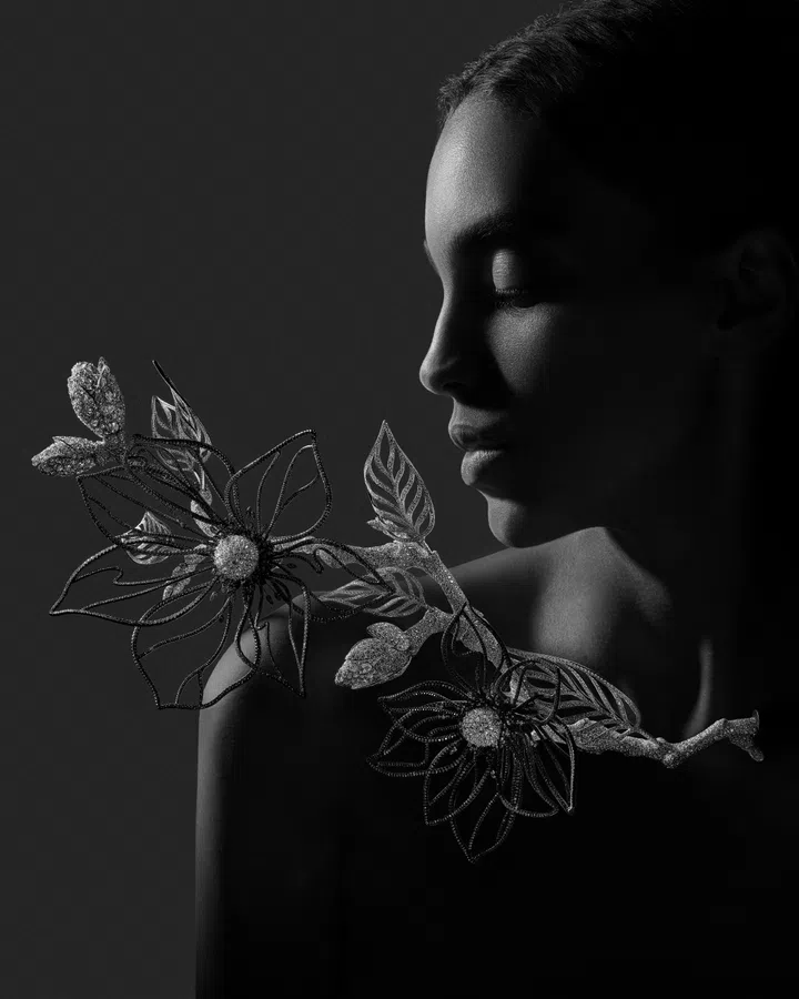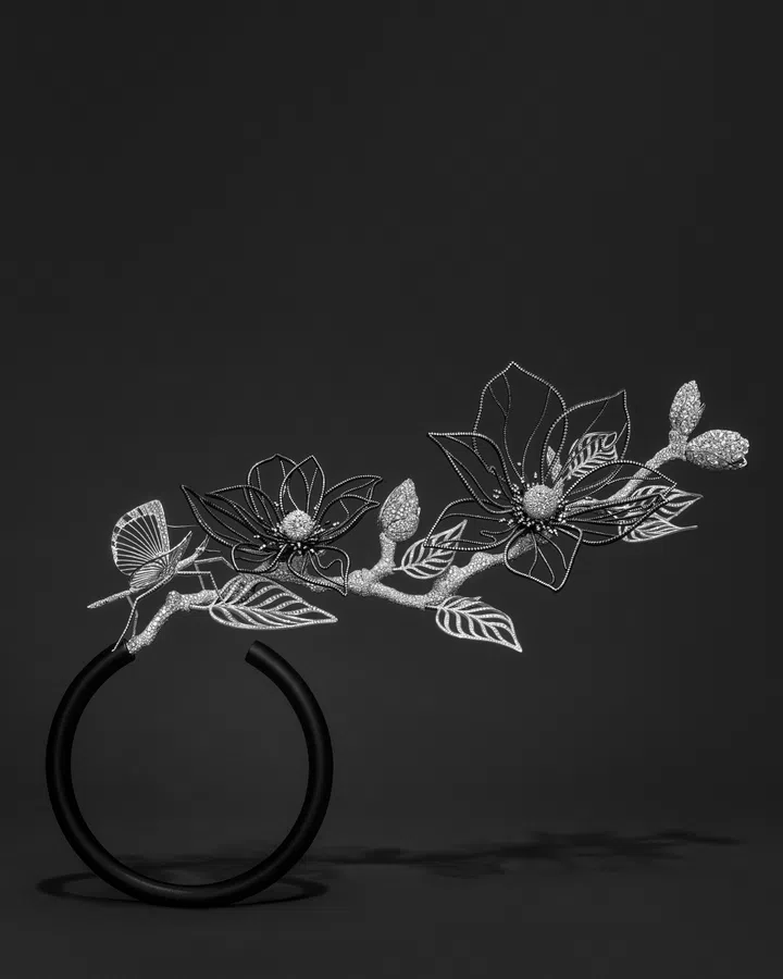 工匠扫描了一株真实的木兰花,包括枝叶、花朵和花蕾,力图惟妙惟肖地再现木兰花的美态。花植以铝打造,绽现耀眼的白色光泽,在保留其自然横向舒展造型的同时,令整件作品达至平衡。铝制花瓣覆蓋黑色陶瓷涂层,以下沉式镶嵌法铺镶晶莹钻石,白金花芯则铺镶倒置钻石。竹节虫正在好奇地探索这一光影交错的世界。其身采用白金制作,身体和翅膀饰有钻石。整组作品置于黑色哑光复合材质花瓶中。木兰花可变为头饰或作项链佩戴,竹节虫则可拆下作胸针佩戴。