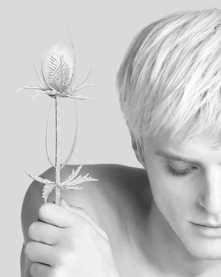 为再现蓟草的野性之美,花头以高分辨率 3D 列印植物性树脂制作而成,在高级珠宝领域采用此种材质尚属首次。为实现此项创新,工匠面对艰巨挑战——因为缺少金属架构,镶嵌钻石难于登天。为此,工匠大师开发出一项全新镶嵌工艺,将 800 多颗钻石直接逐一手工缝合到凹槽内。犀角金龟甲虫及蓟草的茎、尖刺和叶片皆采用白金制作,镶嵌钻石,并覆蓋纤薄的白色陶瓷涂层。整组作品置于白色复合材质花瓶中。将最大的一朵蓟花取下,可当作胸针或跨肩珠宝佩戴,小号蓟草则可变换为戒指,而犀角金龟甲虫可作胸针佩戴。
