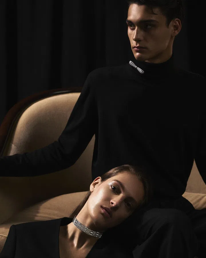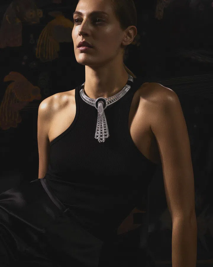 作为对现代男女的完美呼应,Claire Choisne选择探视“咆哮的20年代”(Roaring Twenties))中,高级订制时装的精神与对立美学,如女性阴柔魅力和男性阳刚气质的强烈对比,富丽而简单的线条,以及黑白相间上的一抺色彩碰撞。世家将超凡的珠宝制作技巧运用到Art Déco项链和缎带手炼上,创作出多件极具当代感的珠宝臻品。