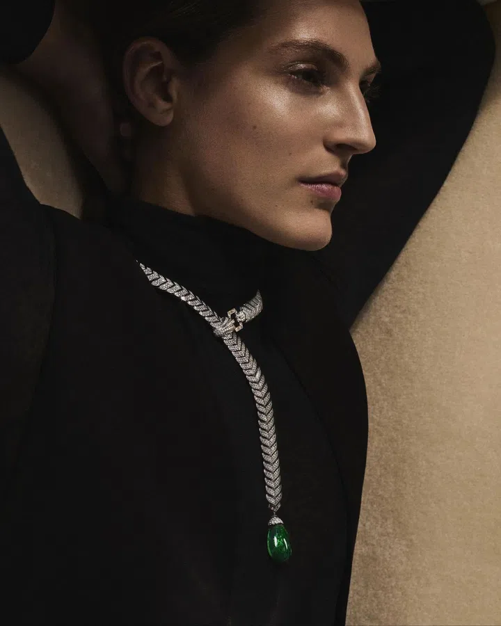 Chevron Emeraude 项链拥有超凡的柔韧度可以随着你的动作而自然摆动,犹如贴在肌肤之上的织锦一样。Claire Choisne回溯起1920年代世家所钟爱的人字形饰纹,描绘出一条镶满钻石但又十分柔韧的白金项链,项链末端是一枚61.35克拉的祖母绿垂坠。这件臻品的大胆之处在其精致绝伦的珠宝扣,可通过滑动珠宝扣,把项链调节至理想的长度。
