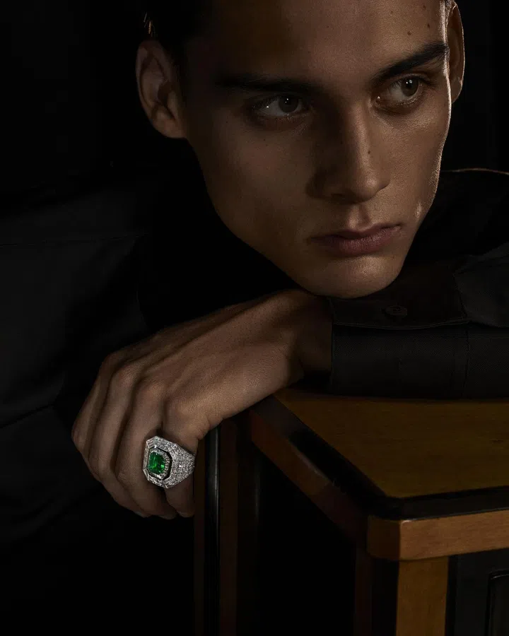 这枚图章戒指将芳登广场宏伟的八角形设计与鹅卵石排列有序地结合在一起。戒指中间镶嵌一枚4.43卡穆索祖母绿,四周被圆形和长方形的钻石包裹着,并饰以黑色边界,镶嵌在无色水晶底座上。就像把功绩彪炳的巴黎徽章戴在手指上一样。
