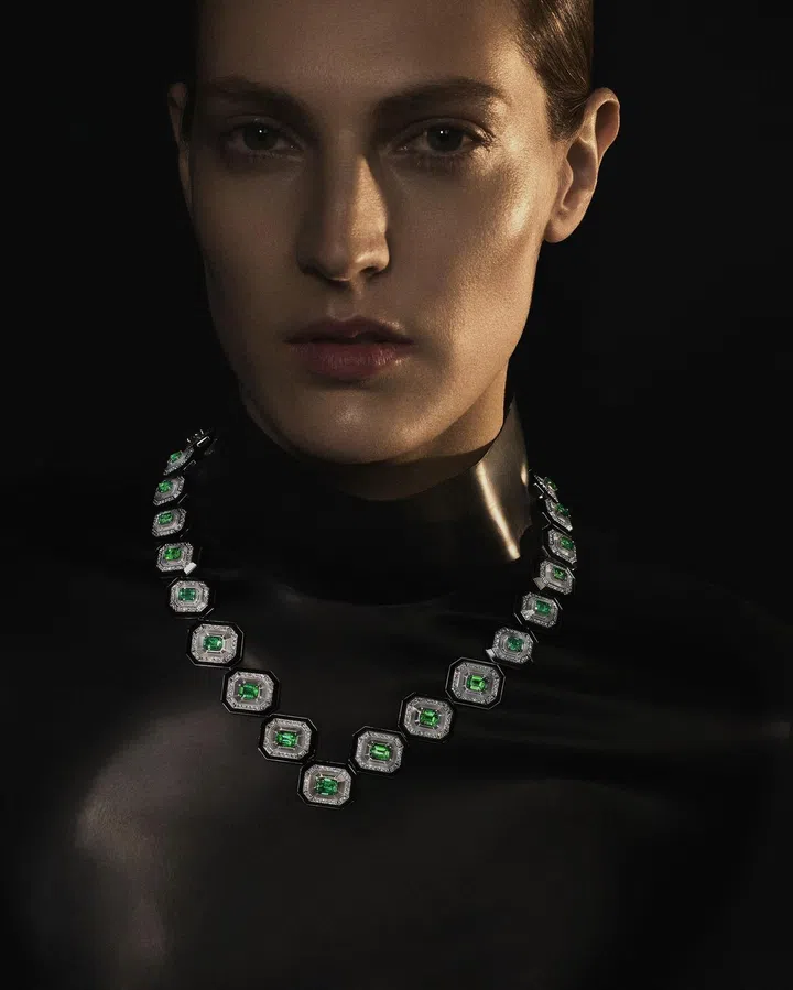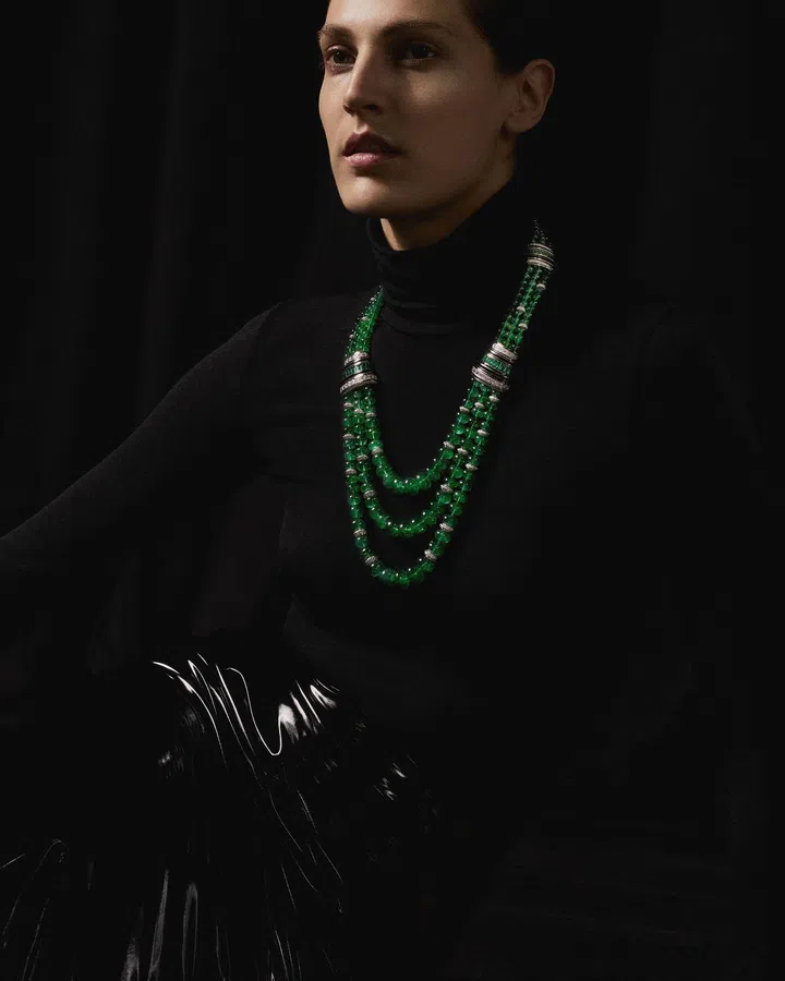 是项链还是盔甲?创作灵感来自世家为印度帕蒂亚拉邦主 (the Maharajah of Patiala) 所制作的项链,镶有220枚祖母绿圆珠,总重1071.97克拉。当时权贵都会视穿戴高级珠宝为荣耀和权力的象征。Claire Choisne粹取了祖母绿纯净的力量和温柔光芒作为设计灵感,按照宝诗龙的传统,这件设计超凡的臻品可以转变为短项链和手镯,同款设计亦包括戒指和两款吊坠耳环。