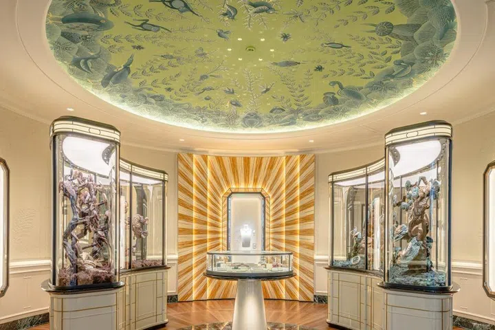 步入室内,空间遵循风水理念展开动线。木质与大理石的细节、书架与椭圆桌的布置,隐约传递出巴黎私人宅邸的氛围。艺术介入则成为叙事的重要一环:艺术家严晓静以灵芝构建“中式森林”,象征长生与生命力;纤维艺术家Huihui则以作品回应当代生态议题;穹顶之上,Claire Nicolet绘制的自然幻境,将植物与动物编织成一个游离现实的天空。