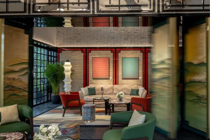 整座约278平方米的空间,被构想为一座连接中法文化的桥梁。建筑外观保留石库门的原始结构,砖墙、拱门与新古典细节勾勒出上海的多元历史;而室内则融入宝诗龙标志性的装饰艺术语汇——对称线条、金属光泽与祖母绿切割轮廓,与东方文化中的曲线与材质相互交织,形成一种克制却流动的视觉语言。