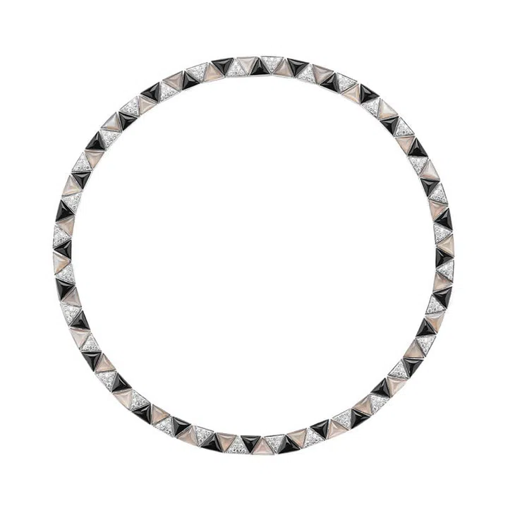 项链共有四种不同佩戴方式可供选择,包括长项链、双缕项链或项圈,而徽章形链坠亦可拆下作为胸针佩戴。