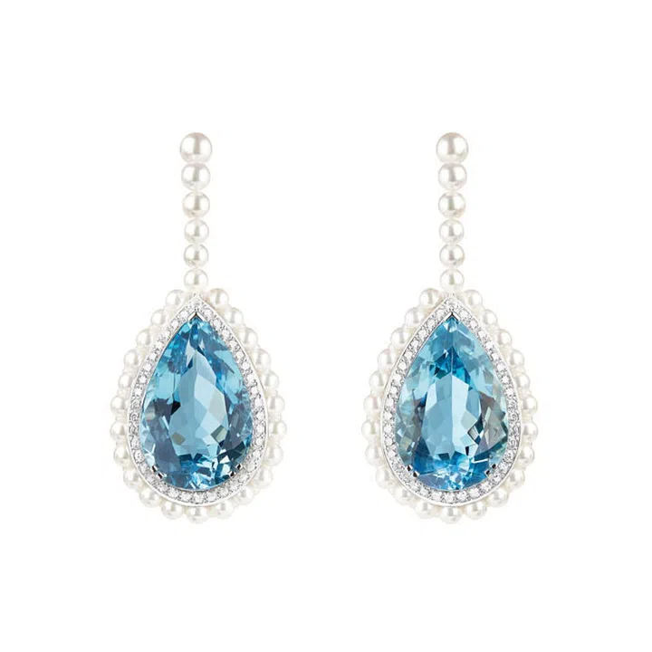 第二章极地美人(Femmes Boreales) 歌颂身披珍珠等珍贵宝石的当代女皇与王后,展现她们身处严冬气候所流露的刚强气魄与妩媚美态。 Baikal紧身胸衣襟饰镶嵌约2000颗珍珠,透过珠宝师巧夺天工的设计,以无数丝线牵结为绳,串连海蓝宝石、半圆珍珠和银钻。78.33克拉的Santa Maria椭圆海蓝宝石如海岛浮徜,仿似浮于汪洋中的蔚蓝海岛,又如贝加尔湖的湖水,瑰丽晶莹,冰洁剔透。