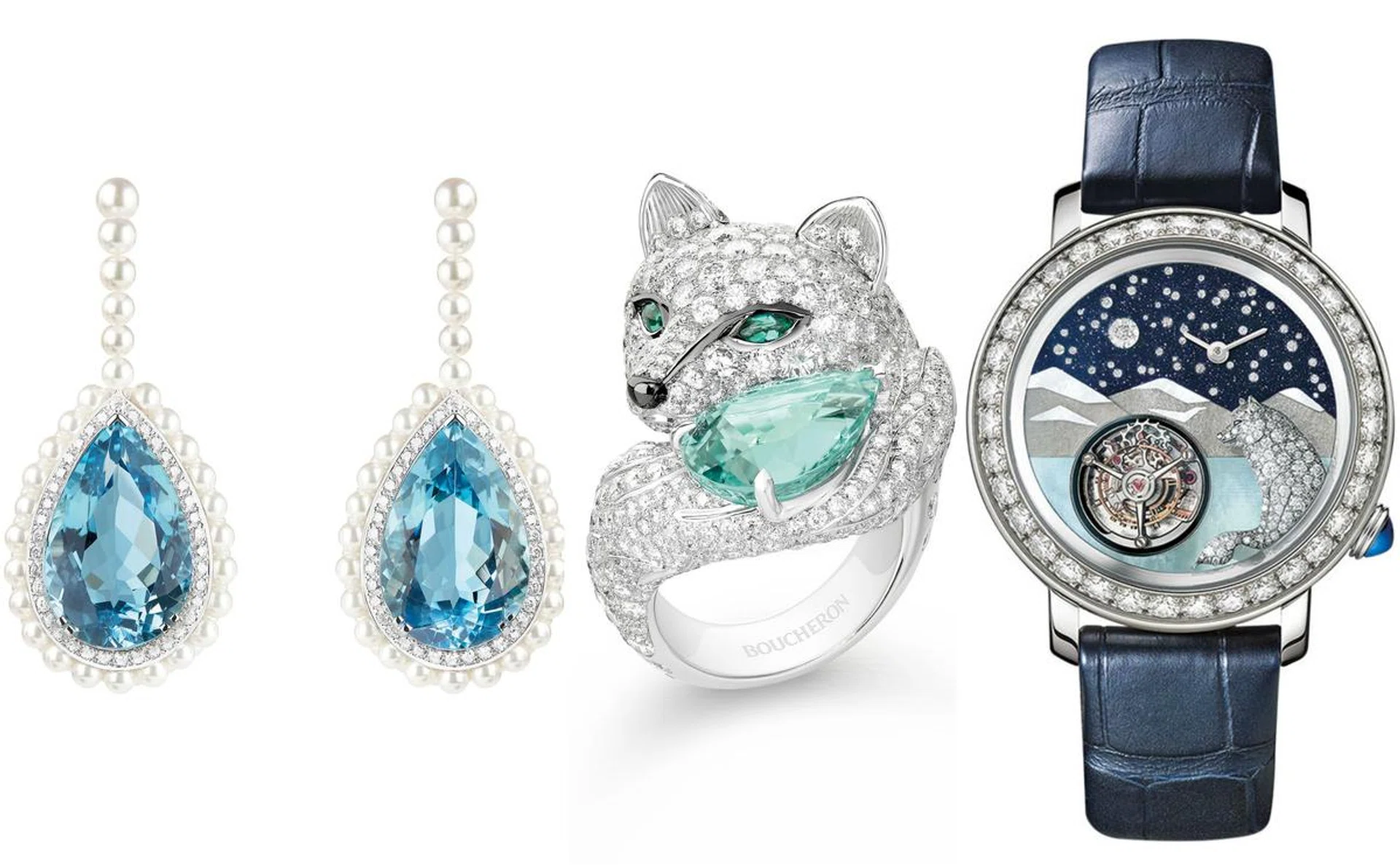 极夜之光系列雪地动物Animaux des Neiges,包括了31.21克拉缅甸蓝宝石的哈士奇雪橇犬Laika、守护13.49克拉海蓝宝石的北极熊Arctique、7.28克拉梨形翠绿碧玺的北极狐Foxy,以及凝视着它们的猫头鹰Oulu、浣熊Ladoga 和山猫Lyncas,工匠甄选异色宝石镶嵌动物眼睛,灵光闪闪。