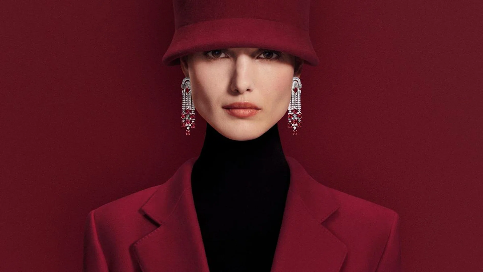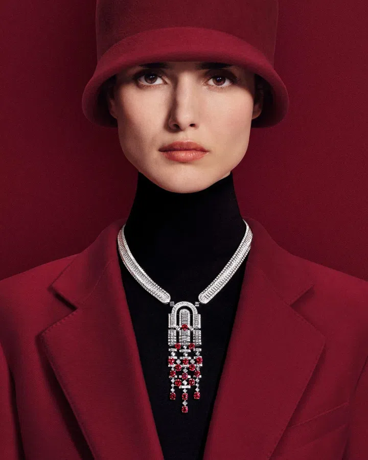 这个主题中的珠宝由34对莫桑比克红宝石和近1300颗圆形、长阶梯形钻石打造,包含一条项链、一对吊坠耳环和一枚戒指。造型以皇室胸针的设计作为原型,借由夸张的宝石铺陈向外无限延伸,完美演绎超现代优雅美学。
