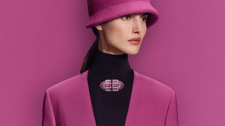 这组双回形胸针提供多种佩戴方式:组合佩戴或单独佩戴。凸圆形和长阶梯形切割的粉红色碧玺夺目吸睛,周围环绕铺镶的钻石与细节处点缀的粉红色漆面则提升了整件作品的层次感,交织缱绻光影,打造出男女皆宜的珠宝作品。