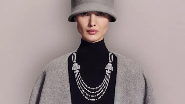 这组支持一饰多戴的珠宝甄选Akoya养殖珍珠和钻石,珍珠的绮丽虹彩在闪耀钻石的衬托下更显柔和,展现刚柔并济的摩登魅力。项链的三条可拆卸链条由175颗Akoya养殖珍珠搭配钻石而打造,下方配有铺镶钻石的Art Deco装饰艺术双回形珠宝扣。珠宝扣亦可拆卸后作为发饰或一对胸针单独佩戴,为翻领燕尾服或高领衫带来无可比拟的优雅格调。