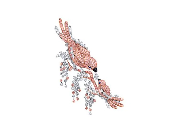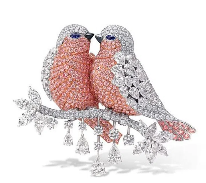 精致的格拉夫(Graff)多形切割粉红钻和白钻雀鸟胸针,以圆形及梨形粉红和白钻捕捉母鸟与雏鸟之间的亲昵时刻,并以缟玛瑙和蓝宝石作点缀,栩栩如生。